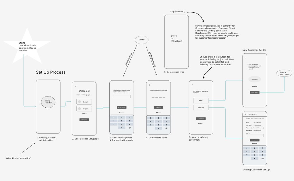 I also found out that Dauus plans to have its Sales Reps assist customers with initial app setup, so I decided to keep the design of this sequence very straightforward since it will be used by Dauus Employees.