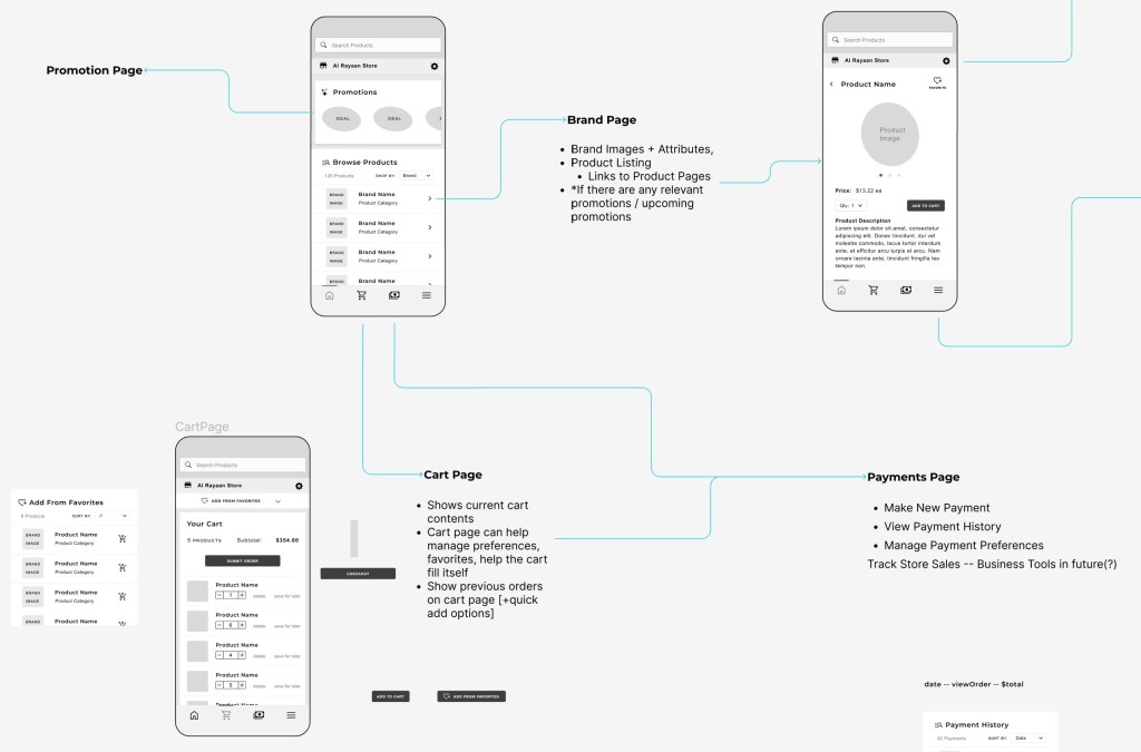 I also drew out a mixed wireflow that used text to stand in for the screens I had yet to create. This helped me to identify what still needed to be designed and keep track of desired functionaliy.